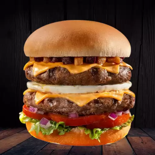 Pão, bife de hambúrguer, queijo, presunto, bacon, ovo, milho verde, alface, tomate e batata palha
