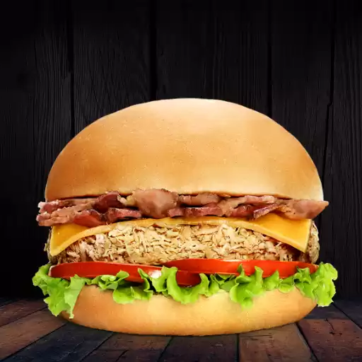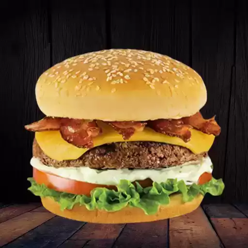 Pão, bife de hambúrguer, queijo, bacon, milho verde, alface, tomate e batata palha